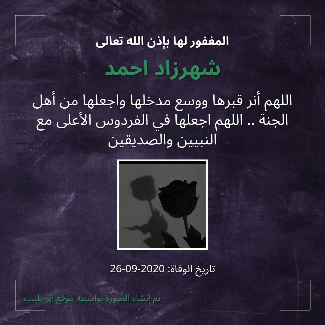 اللهم يا حنان يا منان يا واسع الغفران اغفر لـ شهرزاد احمد وارحمها وعافها واعف عنها، وأكرم نزلها ووسع مدخلها، وأغسلها بالماء والثلج والبرد، ونقها من الذنوب والخطايا كما ينقى الثوب الأبيض من الدنس.
