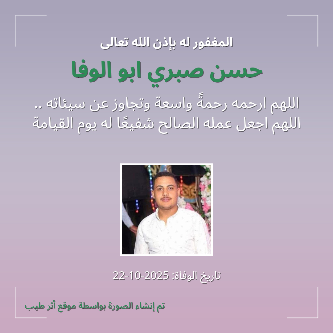 اللهمّ يمّن كتاب حسن صبري ابو الوفا ويسّر حسابه، وثقّل بالحسنات ميزانه، وثبّت على الصّراط أقدامه، وأسكنه في أعلى الجنّات، بجوار حبيبك ومصطفاك صلّى الله عليه وسلّم.