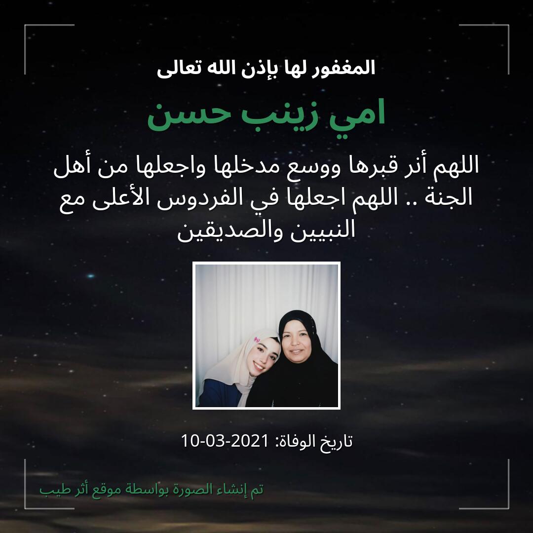 اللهم يمّن كتاب امي زينب حسن ويسّر حسابها، وثقّل بالحسنات ميزانها، وثبّت على الصراط أقدامها، وأسكنها في أعلى الجنات بجوار حبيبك ومصطفاك صلّى الله عليه وسلّم.