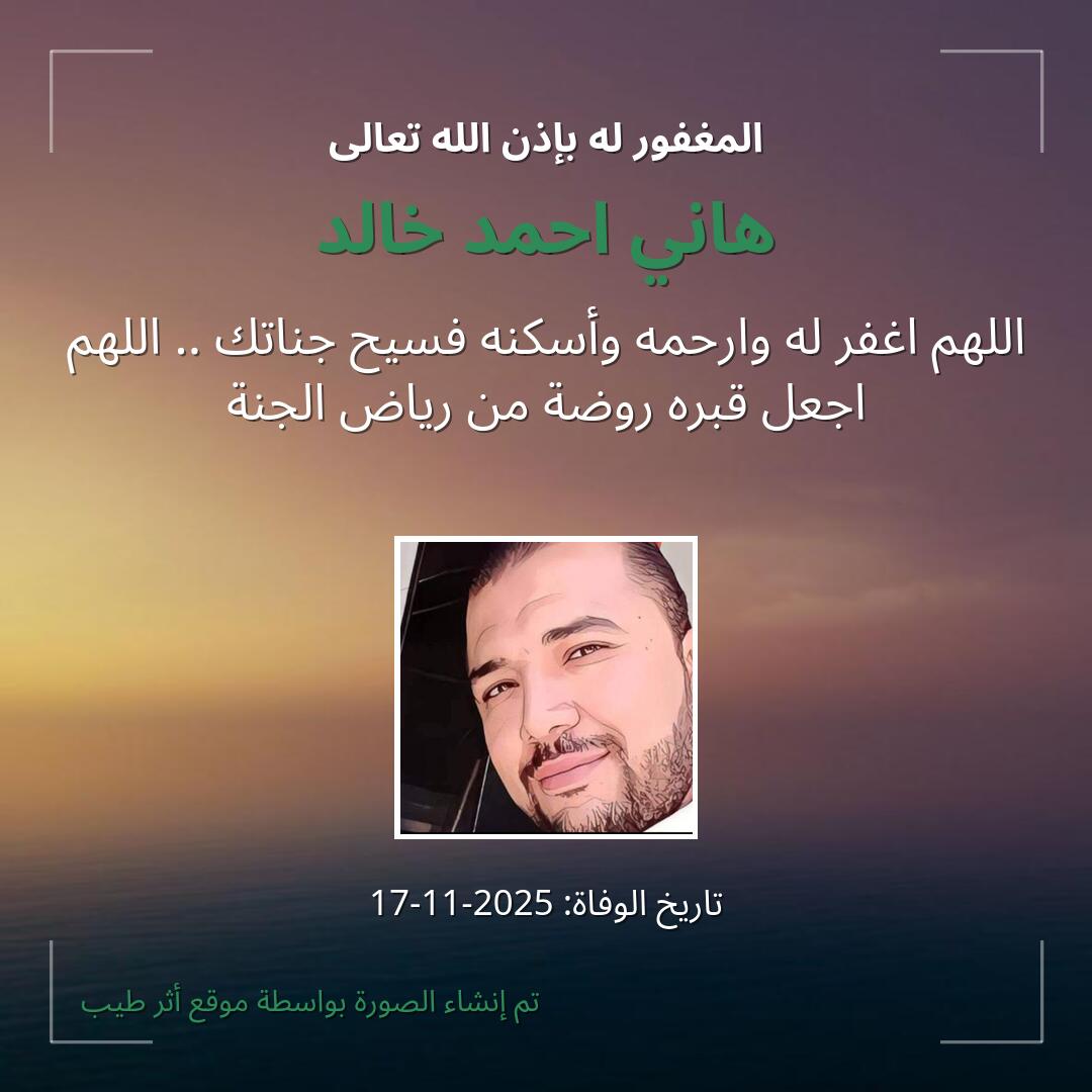 بمشاركتك هذه الصفحة، تساهم في نشر الخير والدعاء للمرحوم هاني احمد خالد.