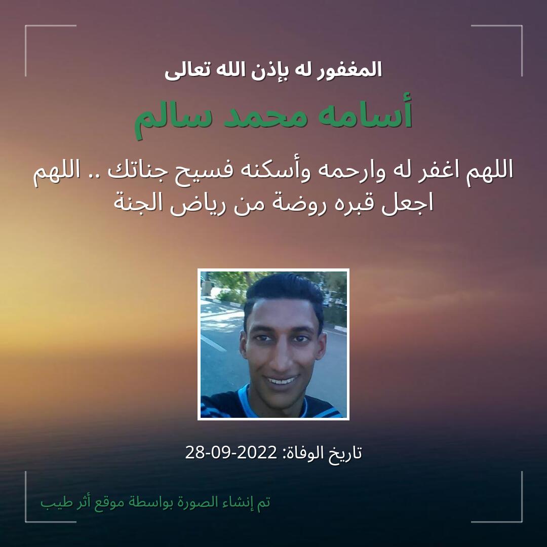 اللهم يا حنان يا منان يا واسع الغفران اغفر لـ أسامه محمد سالم وارحمه وعافه واعف عنه، وأكرم نزله ووسع مدخله، وأغسله بالماء والثلج والبرد، ونقه من الذنوب والخطايا كما ينقى الثوب الأبيض من الدنس.