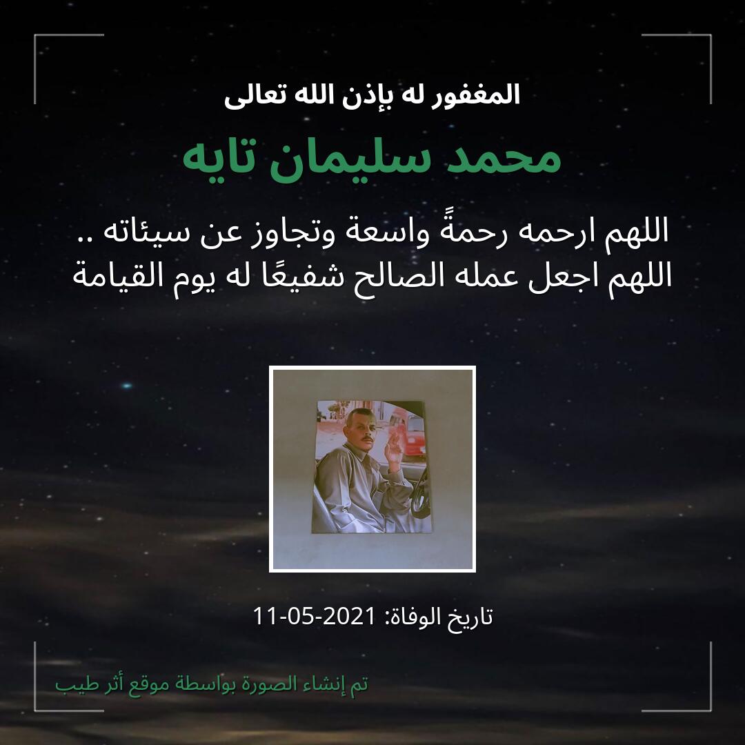 اللهم يا حنان يا منان يا واسع الغفران اغفر لـ محمد سليمان تايه وارحمه وعافه واعف عنه، وأكرم نزله ووسع مدخله، وأغسله بالماء والثلج والبرد، ونقه من الذنوب والخطايا كما ينقى الثوب الأبيض من الدنس.