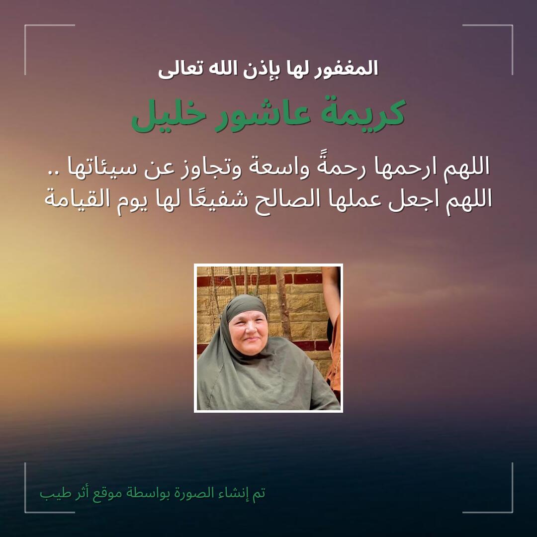 اللهم يا حنان يا منان يا واسع الغفران اغفر لـ كريمة عاشور خليل وارحمها وعافها واعف عنها، وأكرم نزلها ووسع مدخلها، وأغسلها بالماء والثلج والبرد، ونقها من الذنوب والخطايا كما ينقى الثوب الأبيض من الدنس.