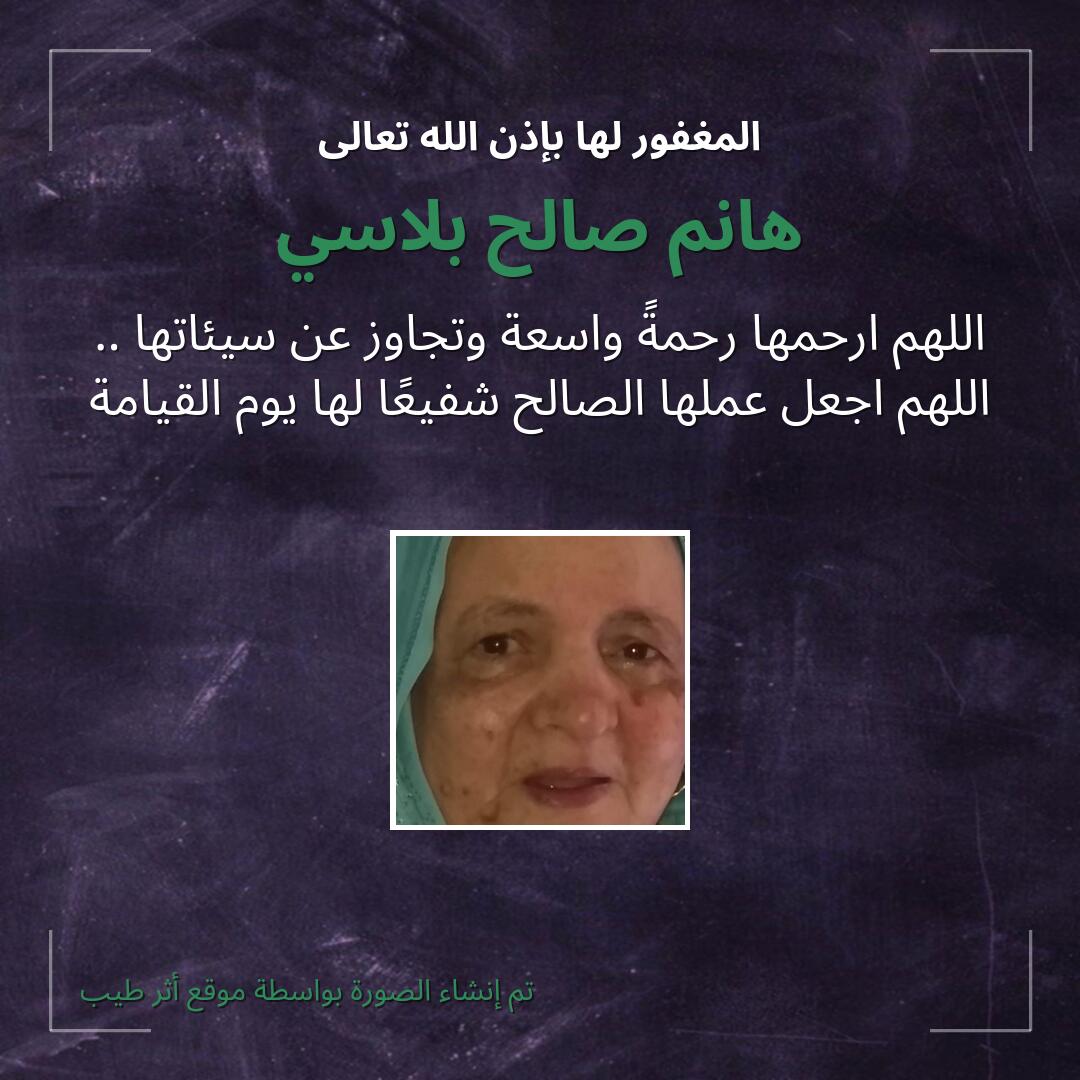 بمشاركتك هذه الصفحة، تساهم في نشر الخير والدعاء للمرحومة هانم صالح بلاسي.
