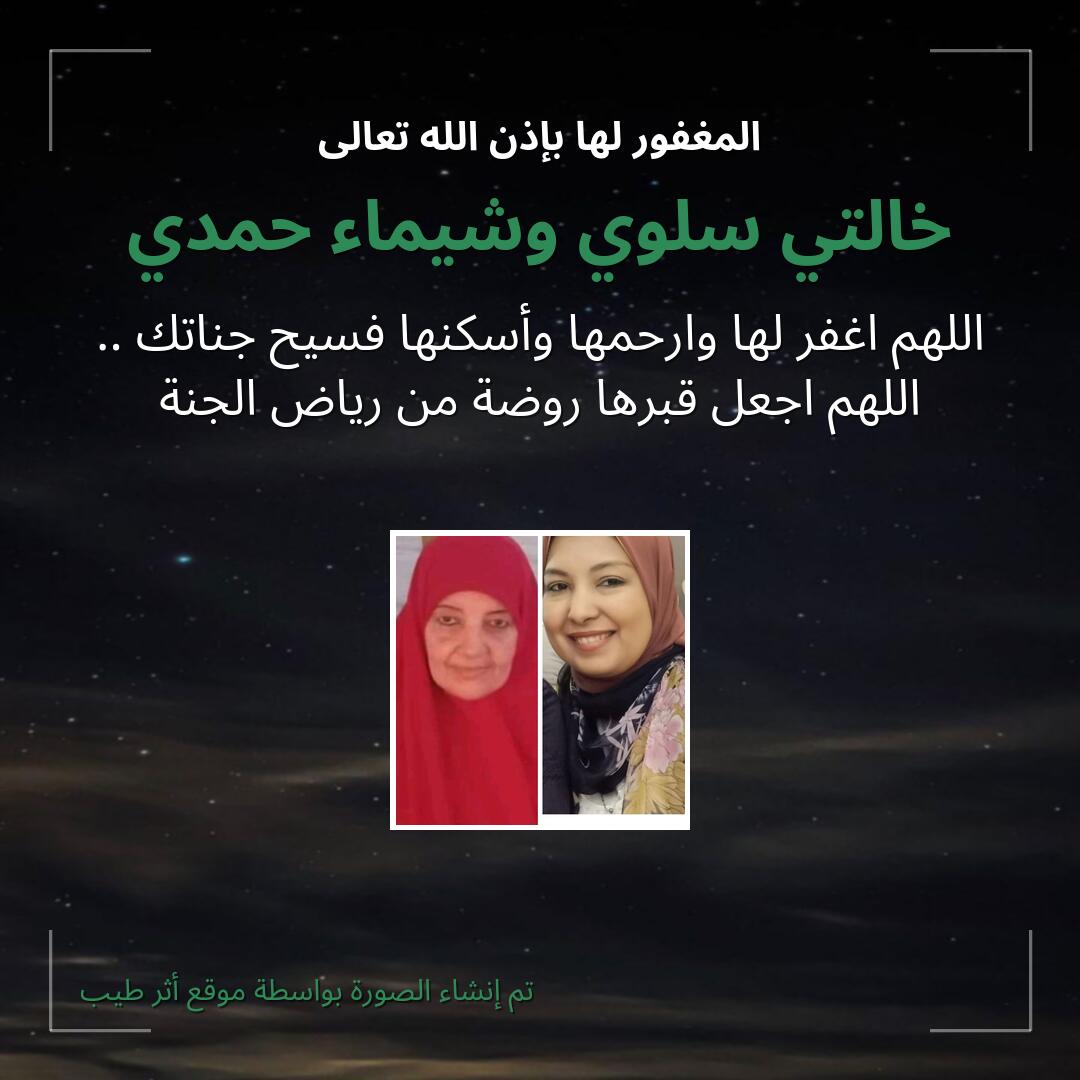 اللهم اجعل قبر خالتي سلوي وشيماء حمدي روضة من رياض الجنة، ولا تجعله حفرة من حفر النار، اللهم أسكنها الفردوس الأعلى من الجنة، وأنر قبرها ووسع مدخلها يا حليم يا غفار.