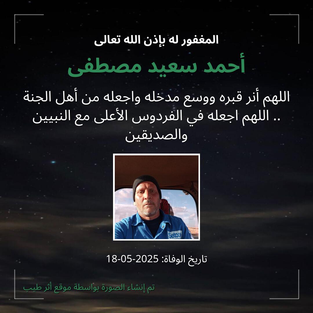 بمشاركتك هذه الصفحة، تساهم في نشر الخير والدعاء للمرحوم أحمد سعيد مصطفى.