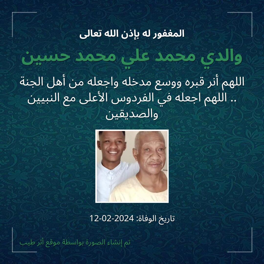 اللهم يا حنان يا منان يا واسع الغفران اغفر لـ والدي محمد علي محمد حسين وارحمه وعافه واعف عنه، وأكرم نزله ووسع مدخله، وأغسله بالماء والثلج والبرد، ونقه من الذنوب والخطايا كما ينقى الثوب الأبيض من الدنس.