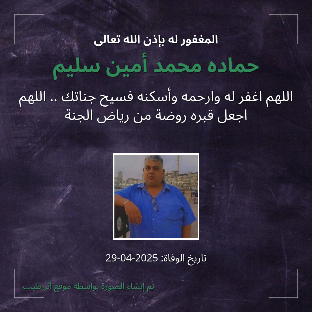 اللهم يا حنان يا منان يا واسع الغفران اغفر لـ حماده محمد أمين سليم وارحمه وعافه واعف عنه، وأكرم نزله ووسع مدخله، وأغسله بالماء والثلج والبرد، ونقه من الذنوب والخطايا كما ينقى الثوب الأبيض من الدنس.