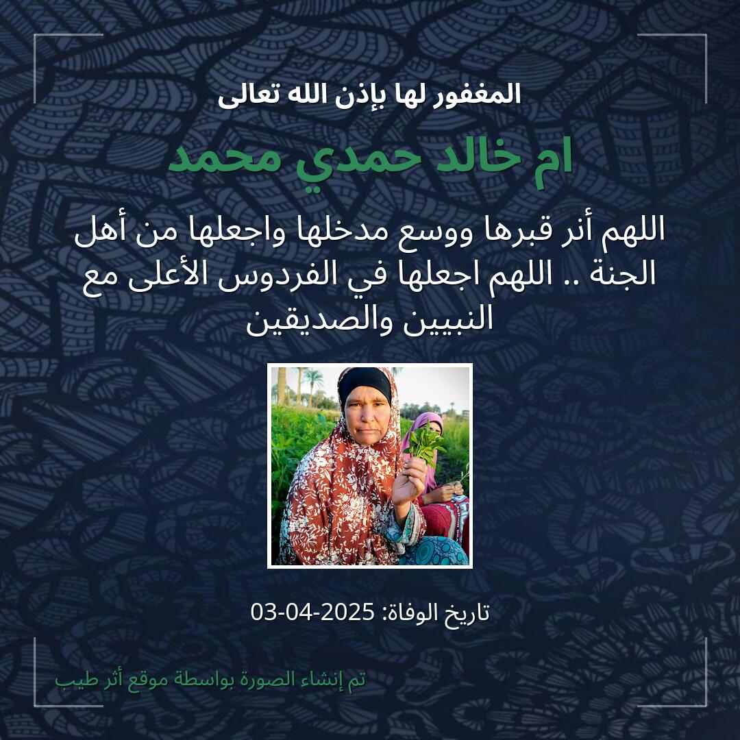 بمشاركتك هذه الصفحة، تساهم في نشر الخير والدعاء للمرحومة ام خالد حمدي محمد.