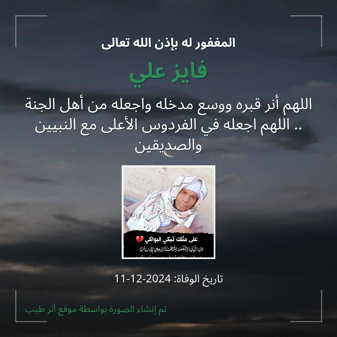 اللهم يا حنان يا منان يا واسع الغفران اغفر لـ فايز علي وارحمه وعافه واعف عنه، وأكرم نزله ووسع مدخله، وأغسله بالماء والثلج والبرد، ونقه من الذنوب والخطايا كما ينقى الثوب الأبيض من الدنس.