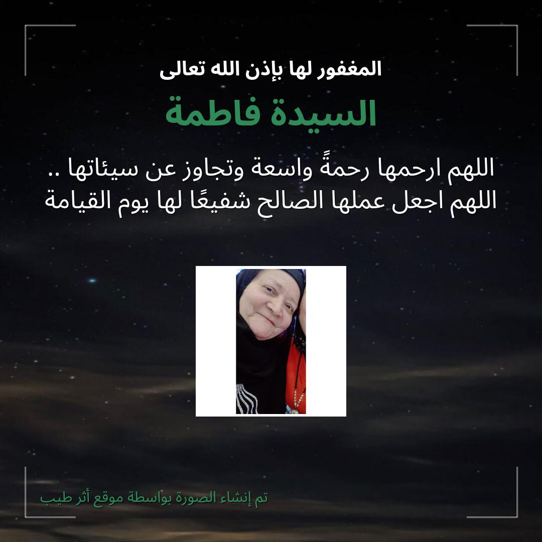 اللهم اجعل عن يمين السيدة فاطمة نورًا، حتى تبعثها آمنة مطمئنة في نورٍ من نورك. اللهمّ انظر إليها نظرة رضا، فإنّ من تنظُر إليه نظرة رضًا لا تعذّبه أبدًا. اللهمّ أسكنها فسيح الجنان، واغفر لها يا رحمن، وارحمها يا رحيم، وتجاوز عمّا تعلم يا عليم. اللهمّ اعف عنها، فإنّك القائل ويعفو عن كثير.