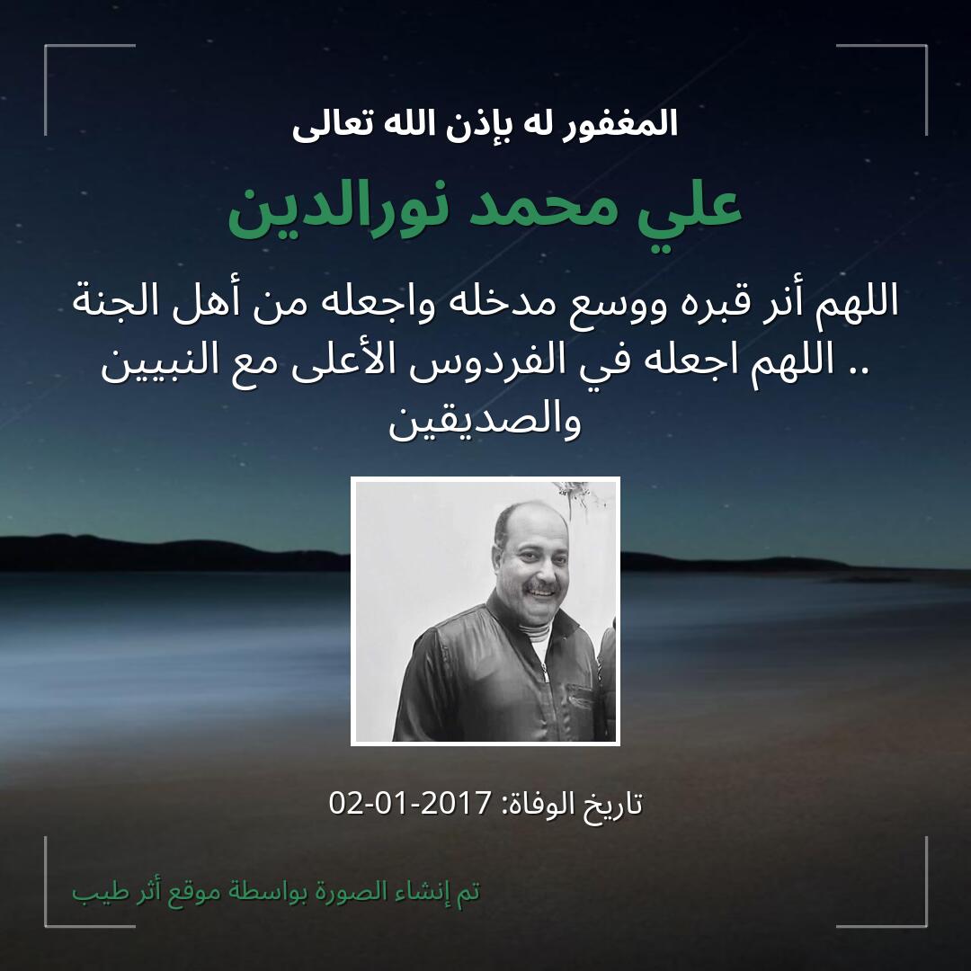 اللهم يا حنان يا منان يا واسع الغفران اغفر لـ علي محمد نورالدين وارحمه وعافه واعف عنه، وأكرم نزله ووسع مدخله، وأغسله بالماء والثلج والبرد، ونقه من الذنوب والخطايا كما ينقى الثوب الأبيض من الدنس.