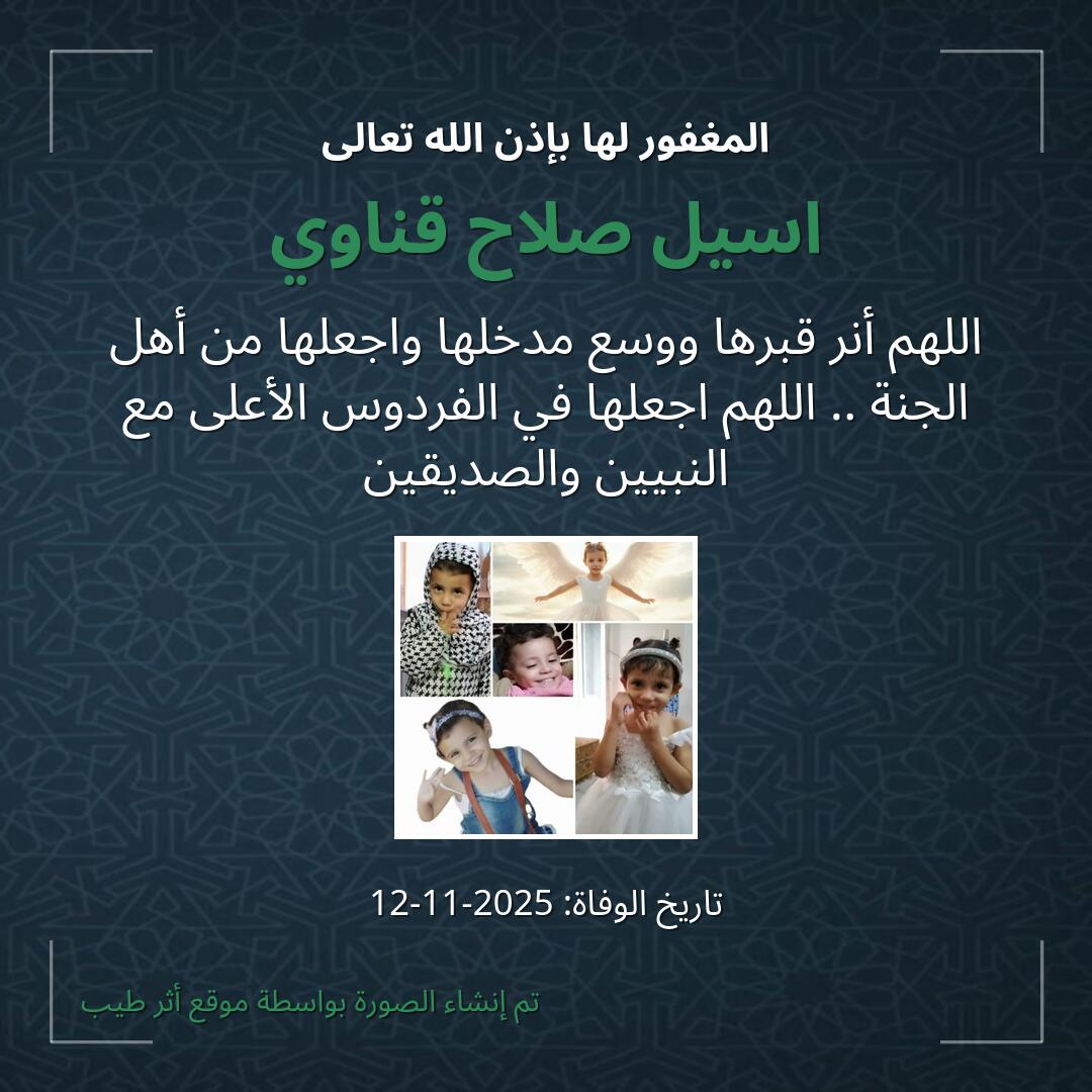 بمشاركتك هذه الصفحة، تساهم في نشر الخير والدعاء للمرحومة اسيل صلاح قناوي.