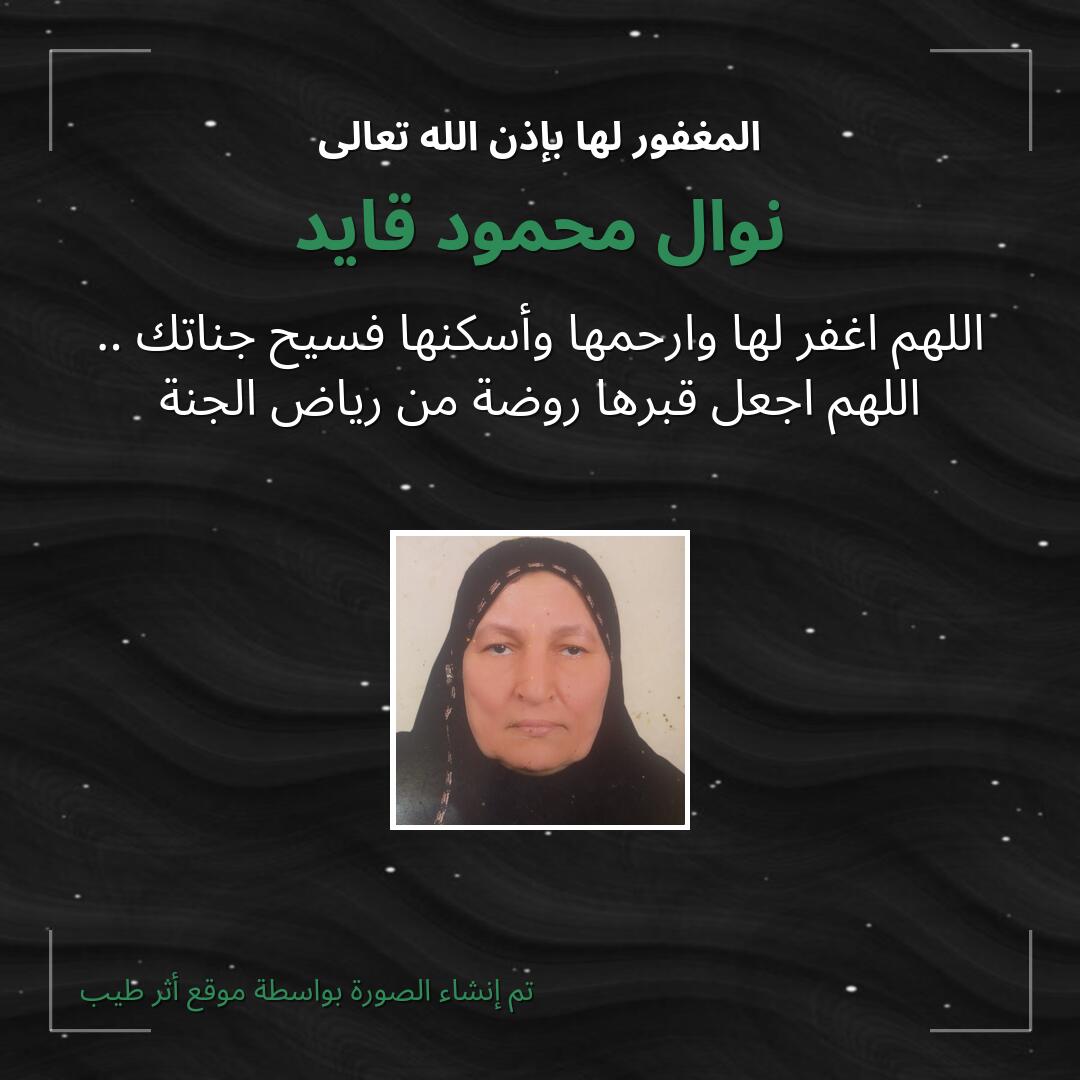 اللهم اجعل قبر نوال محمود قايد روضة من رياض الجنة، ولا تجعله حفرة من حفر النار، اللهم أسكنها الفردوس الأعلى من الجنة، وأنر قبرها ووسع مدخلها يا حليم يا غفار.