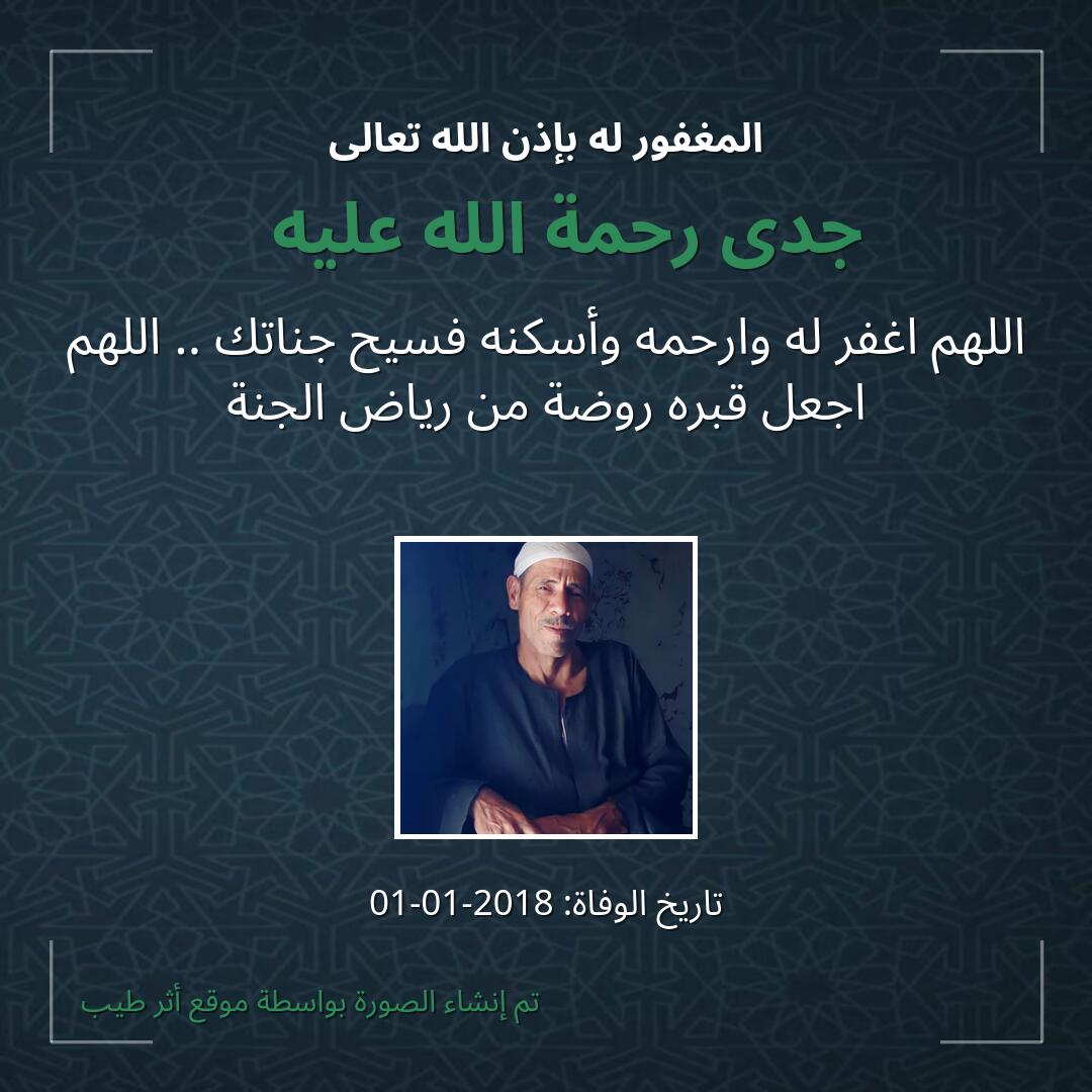 اللهم اجعل عن يمين جدى رحمة الله عليه😭 نورًا، حتى تبعثه آمنًا مطمئنًا في نورٍ من نورك. اللهمّ انظر إليه نظرة رضا، فإنّ من تنظُر إليه نظرة رضًا لا تعذّبه أبدًا. اللهمّ أسكنه فسيح الجنان، واغفر له يا رحمن، وارحمه يا رحيم، وتجاوز عمّا تعلم يا عليم. اللهمّ اعف عنه، فإنّك القائل ويعفو عن كثير.