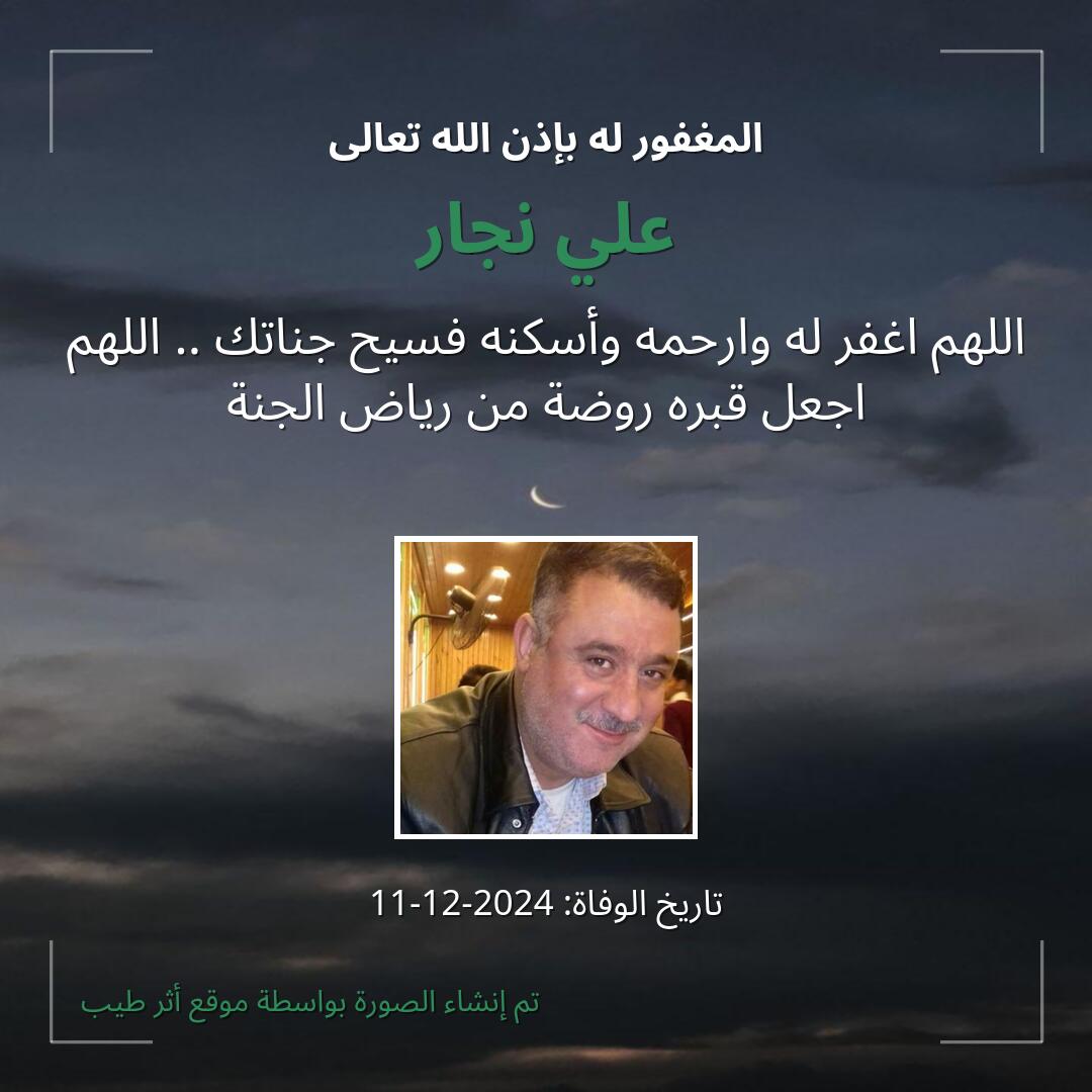 بمشاركتك هذه الصفحة، تساهم في نشر الخير والدعاء للمرحوم علي نجار.