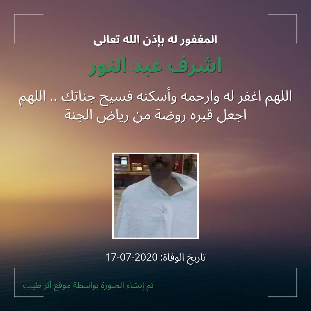 اللهم يا حنان يا منان يا واسع الغفران اغفر لـ اشرف عبد النور وارحمه وعافه واعف عنه، وأكرم نزله ووسع مدخله، وأغسله بالماء والثلج والبرد، ونقه من الذنوب والخطايا كما ينقى الثوب الأبيض من الدنس.
